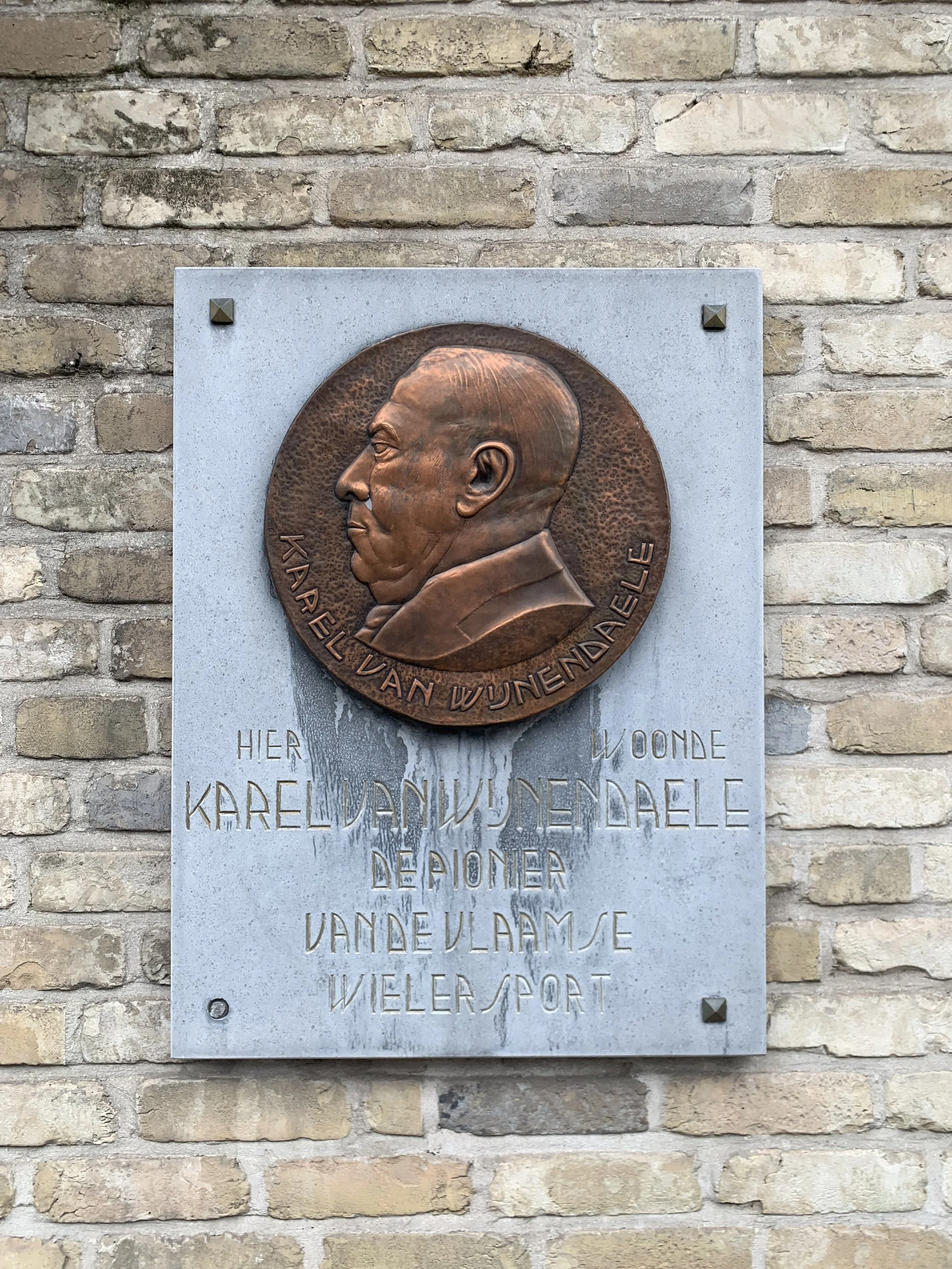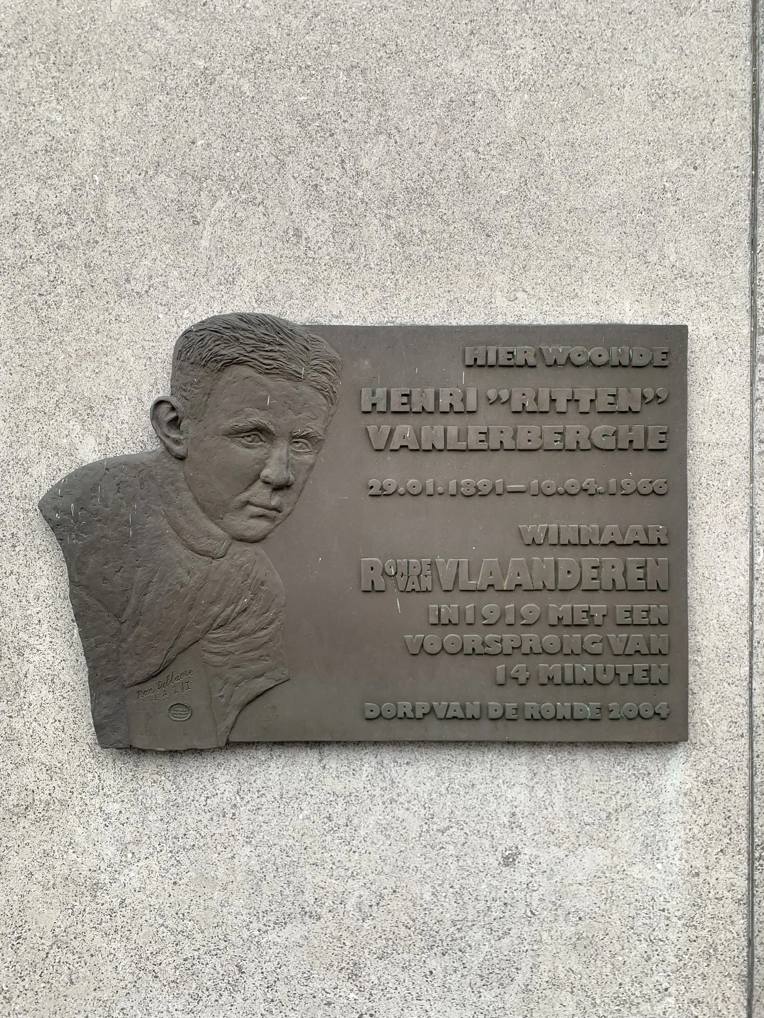 In het hart van Lichtervelde, aan het voormalige woonhuis van Henri “Ritte” Vanlerberghe, prijkt een bronzen gedenkplaat die hulde brengt aan een van de markantste figuren uit de geschiedenis van de Ronde van Vlaanderen.